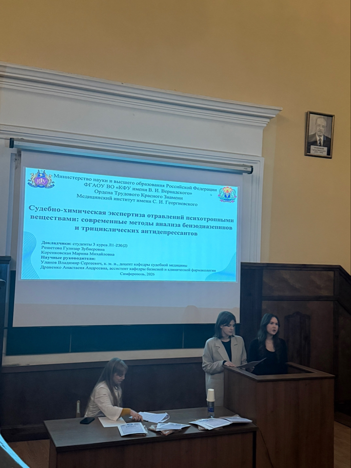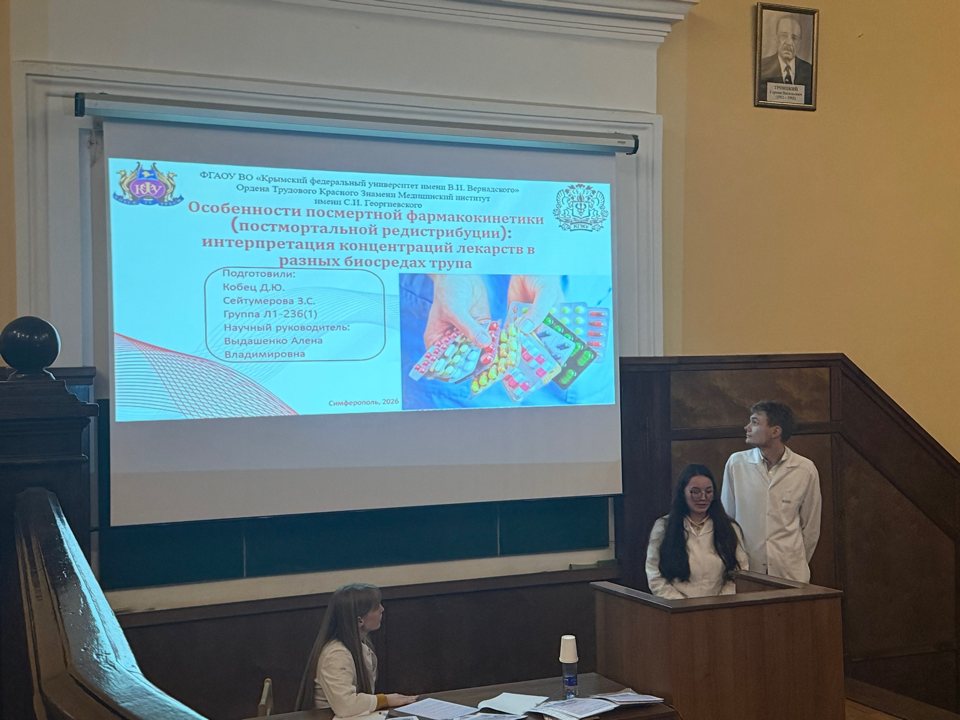12 февраля 2026 года в Медицинском институте имени С.И. Георгиевского Крымского федерального университета состоялась межкафедральная конференция «Возможности определения наличия лекарственных препаратов при судебно-медицинской экспертизе трупа». Мероприятие объединило кафедры базисной и клинической фармакологии, судебной медицины, а также мобилизационной подготовки здравоохранения и медицины катастроф, что подчеркнуло его междисциплинарный характер.