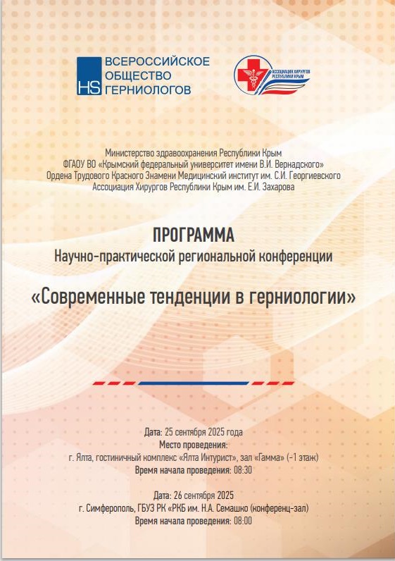 Министерством здравоохранения Республики Крым, Медицинским институтом им. С.И. Георгиевского, Ассоциацией Хирургов Республики Крым им. Е.И. Захарова совместно со Всероссийским обществом герниологов 25-26 сентября текущего года проведено обучающее мероприятие — научно-практическая конференция «Современные тенденции в герниологии». Мероприятие состояло из теоретической и практической частей. Теоретическая часть состоялась 25. 09. 2025 в рамках Х юбилейной медицинской выставки «ЗДРАВООХРАНЕНИЕ. КРЫМ 2025», проведенной в АО «Г/к «Ялта- Интурист».