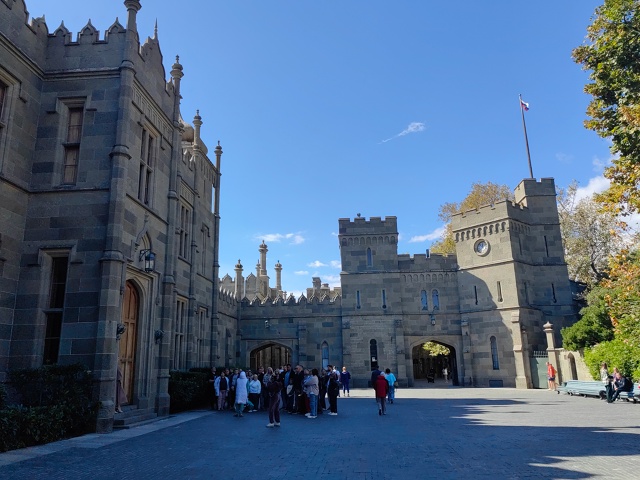 Из чащи парка возникли сторожевые башни английского замка, являющиеся архитектурной стилизацией Воронцовского дворца с северо-западной стороны. Классические узкие улочки замка-дворца вели нас к главному зданию и кассам. И вот мы вышли на главную площадь перед дворцом. Конечно многие из нас помнят этот удивительный замок-дворец ещё с детства, он по праву считается одним из символов Крыма, но регулярно дух захватывает от величия и строгости диабазовых стен и башен и классической английской архитектуры! Под сенью векового восточного платана, мы ждали своей очереди на экскурсию и наслаждались видами корпусов дворца.